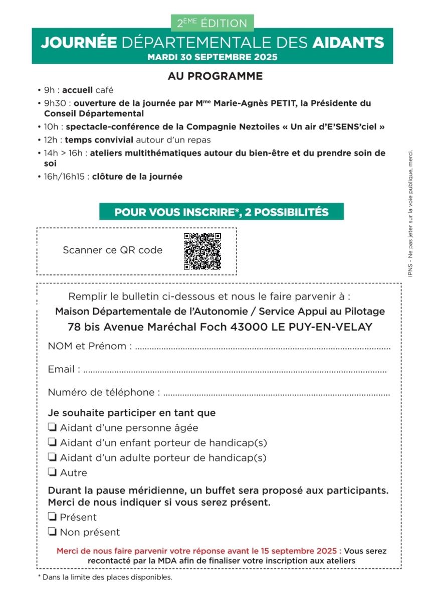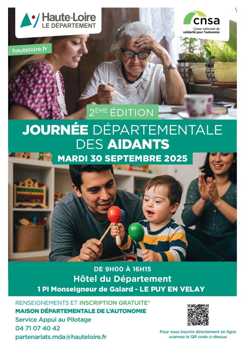 Le Département de la Haute-Loire vous convie à la 2ème édition de la Journée Départementale des Aidants, un événement essentiel dédié à la reconnaissance et au soutien des aidants auprès des personnes âgées ou des personnes en situation de handicap (enfant ou adulte) de notre département.