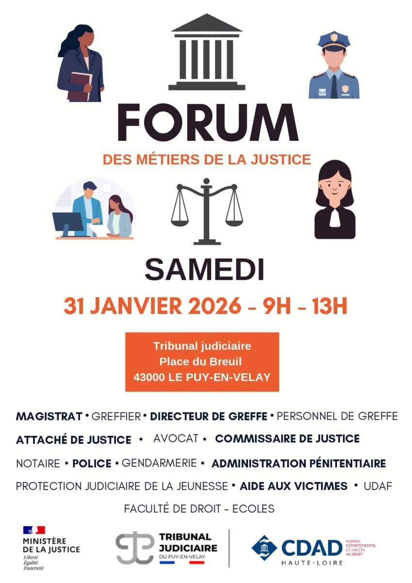 📣 Rappel : Suite au succès des deux premières années, le CDAD de Haute-Loire organise la 3e édition du Forum des Métiers de la Justice qui aura lieu le Samedi 31 Janvier 2026 de 9h à 13h au sein du Tribunal Judiciaire du Puy en Velay, place du Breuil.