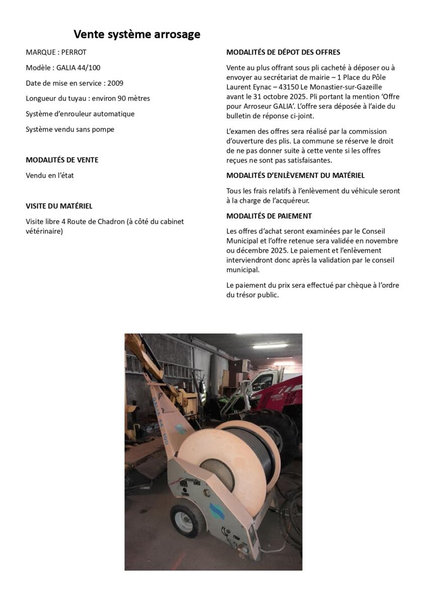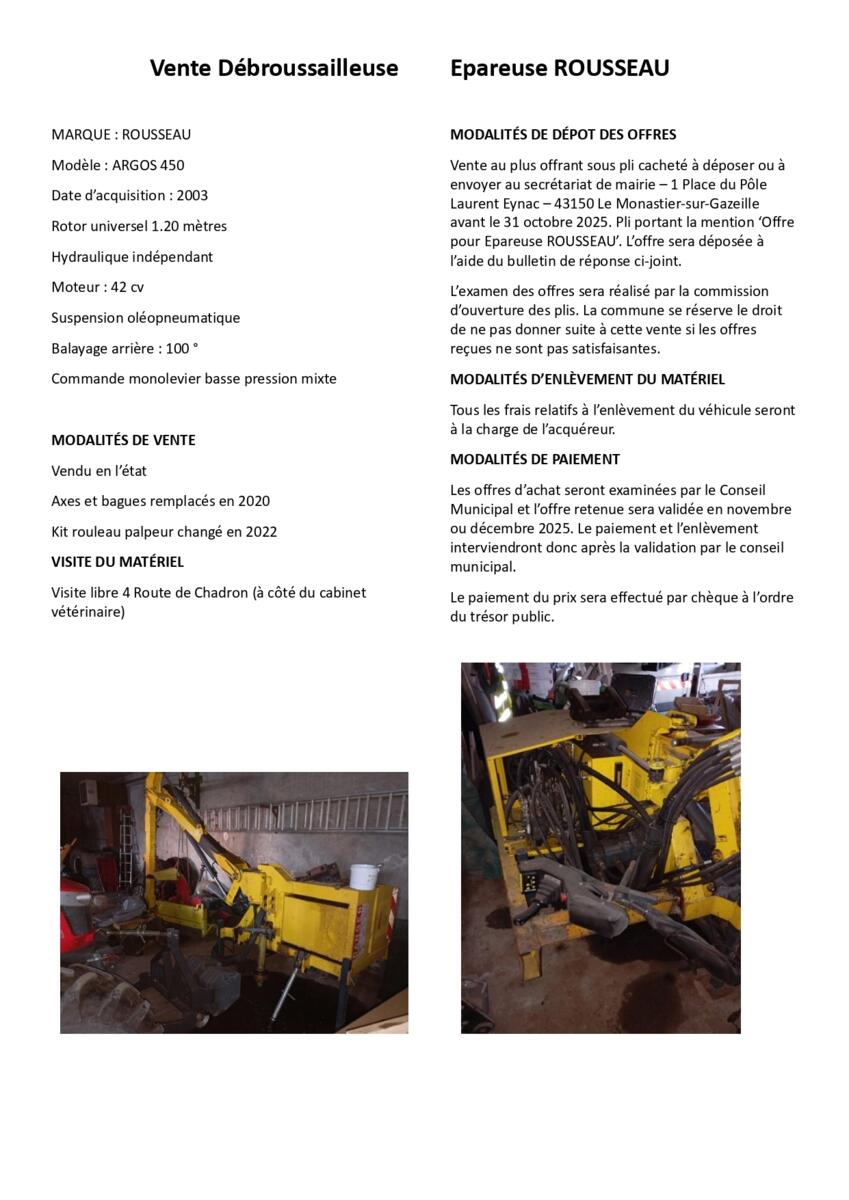 La commune du Monastier propose à la vente l'ancienne épareuse des services techniques de la commune (marque ROUSSEAU) ainsi que l'ancien système d'arrosage du stade (marque PERROT).