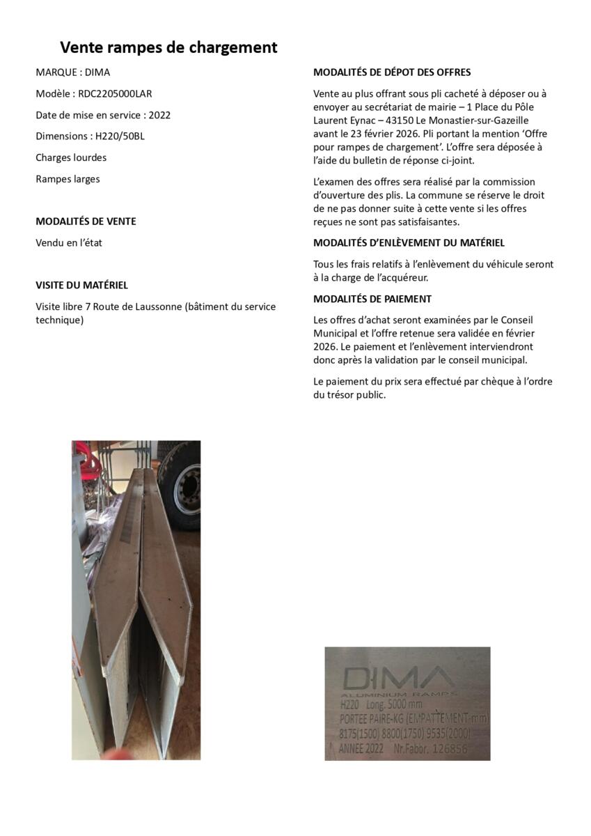Vente matériel communal - Etrave et rampes de chargement