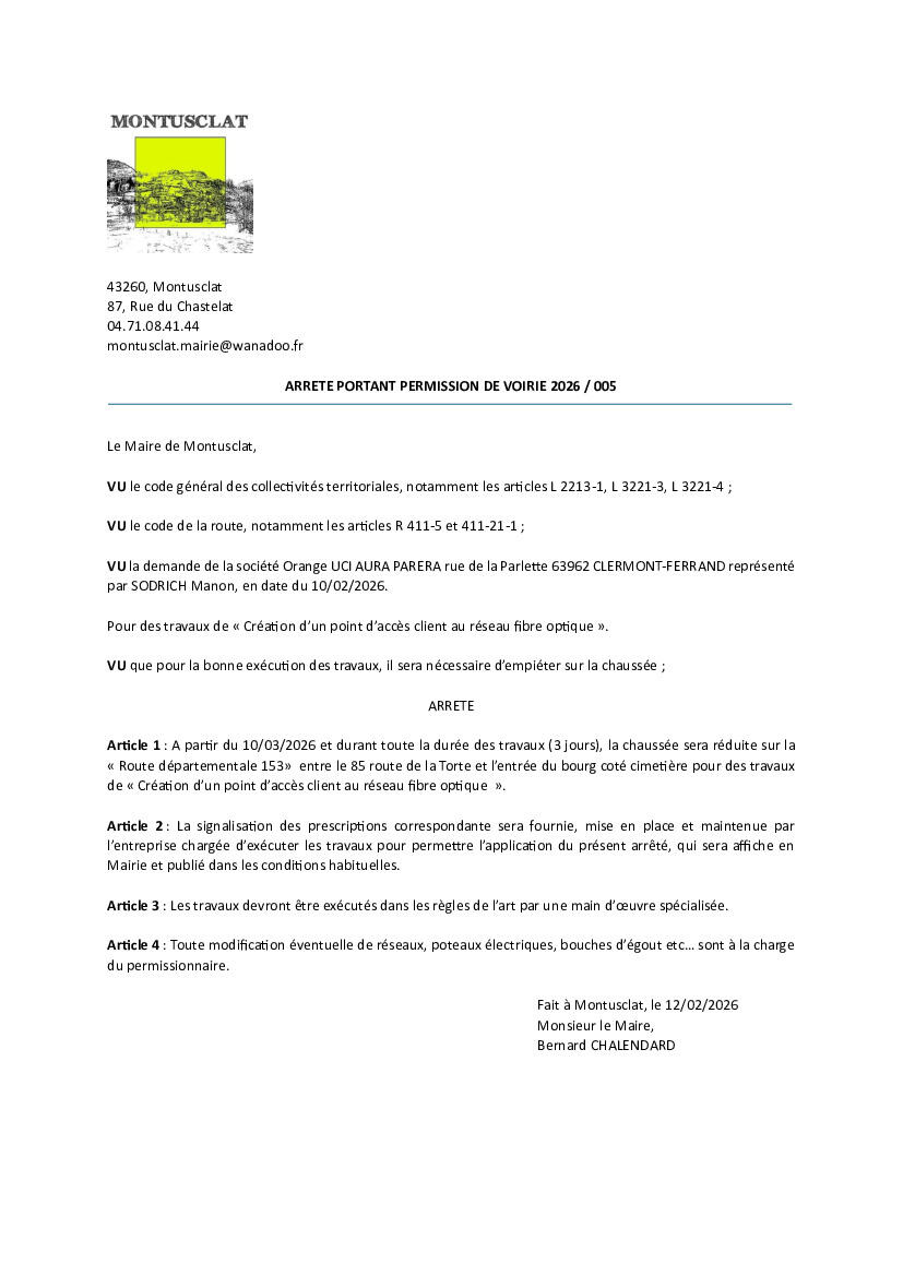 Arrêté de permission de voirie 2/26/26 Ci-dessous deux arrêtés de permissions de voirie Source : Mairie de Montusclat