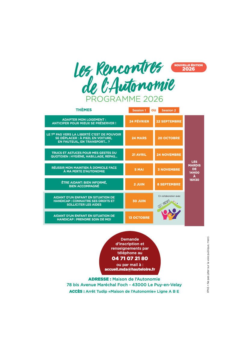 Dans le cadre de nos actions en faveur de l’autonomie des personnes âgées (PA), des personnes handicapées (PH) et de leurs aidants, la Maison Départementale de l'Autonomie (MDA) proposera à nouveau en 2026 "Les Rencontres de l'Autonomie", des ateliers participatifs et adaptés aux besoins des usagers.