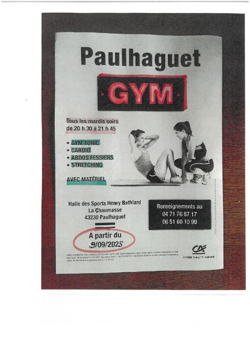 GYM DETENTE 9/8/25 cours de gym les mardis de 20h30 à 21h45 à la Halle des Sports La Chaumasse - PAULHAGUET