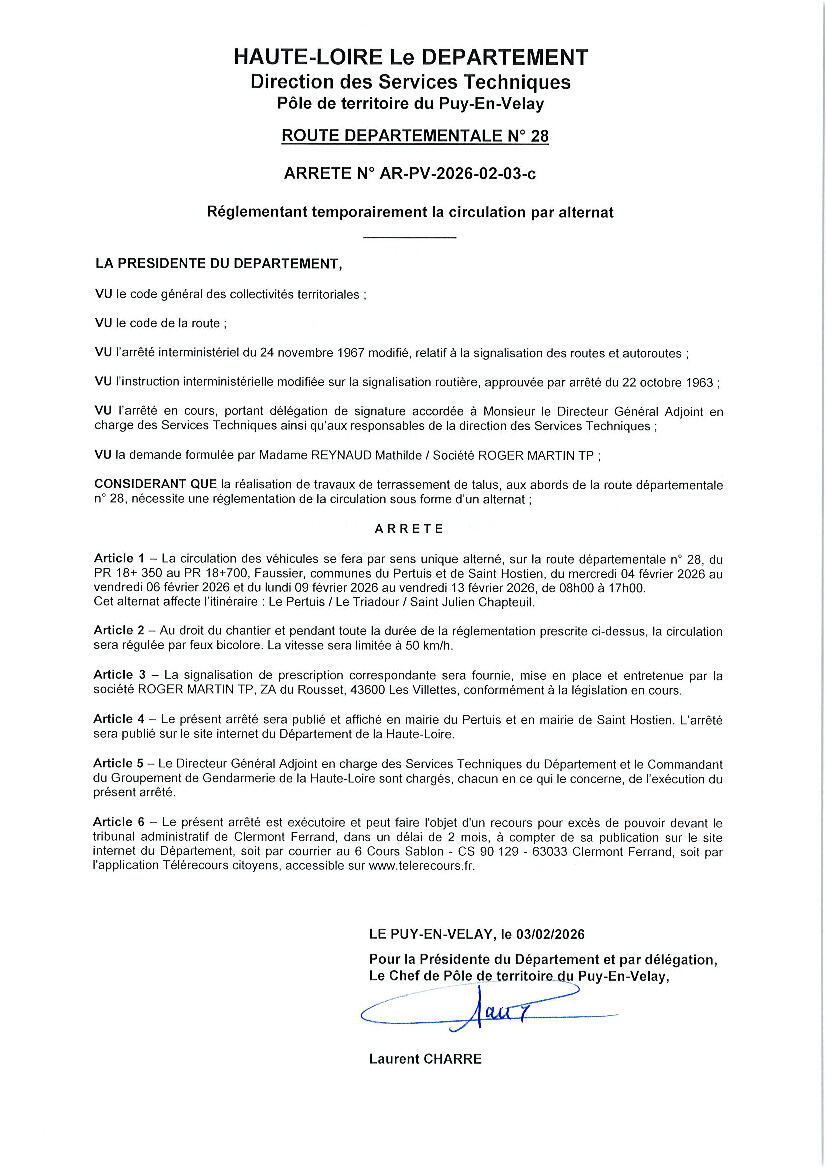 Arrêté portant réglementation temporaire de circulation par alternat  - RD 28 : communes du Pertuis et de Saint Hostien
