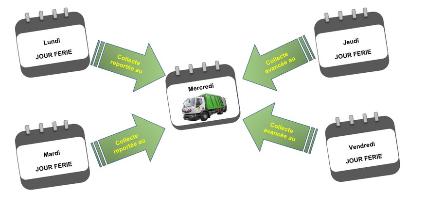 Les jeudis 25/12 et 01/01 étant fériés, le ramassage des ordures ménagères sera exceptionnellement effectué les mercredis précédents, soit les 24/12 et 31/12.