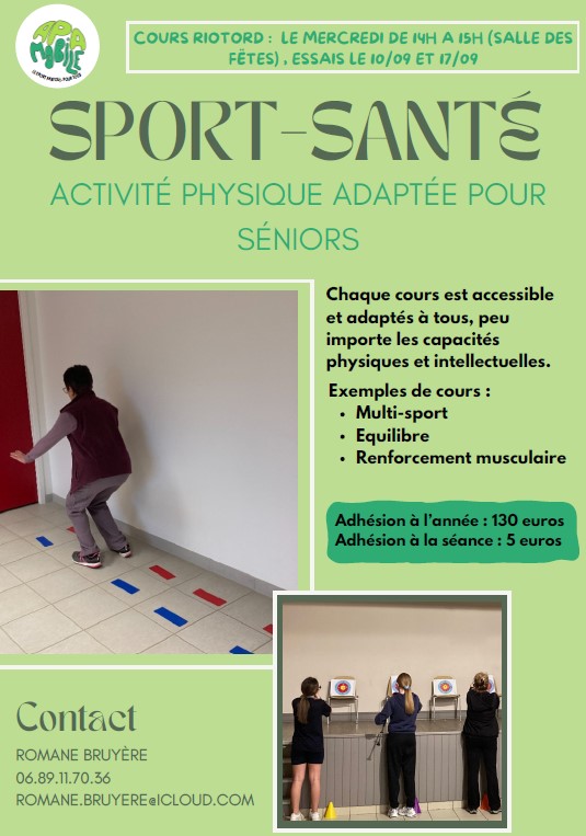 Rentrée 2025-2026, séniors, (re)mettez vous à l'activité physique avec l'APA Mobile. Cours de sport santé à la salle des fêtes de Riotord tous les mercredis de 14h00 à 15h00. N'hésitez pas à venir tester nos cours d'essais gratuits les mercredis 10 et 18 septembre (ouvert à tous).