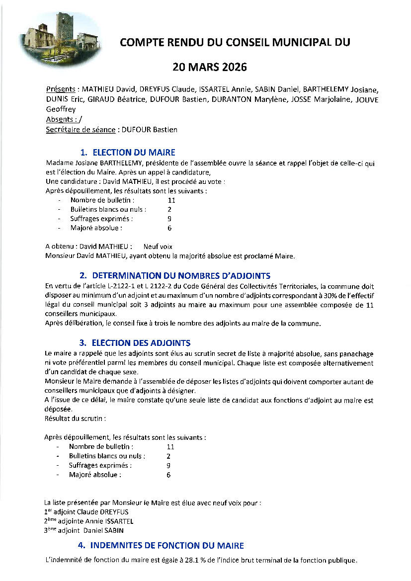 Compte rendu du conseil municipal du 20 03 2026 4/14/26 Ci-dessous le dernier compte rendu du conseil municipal :