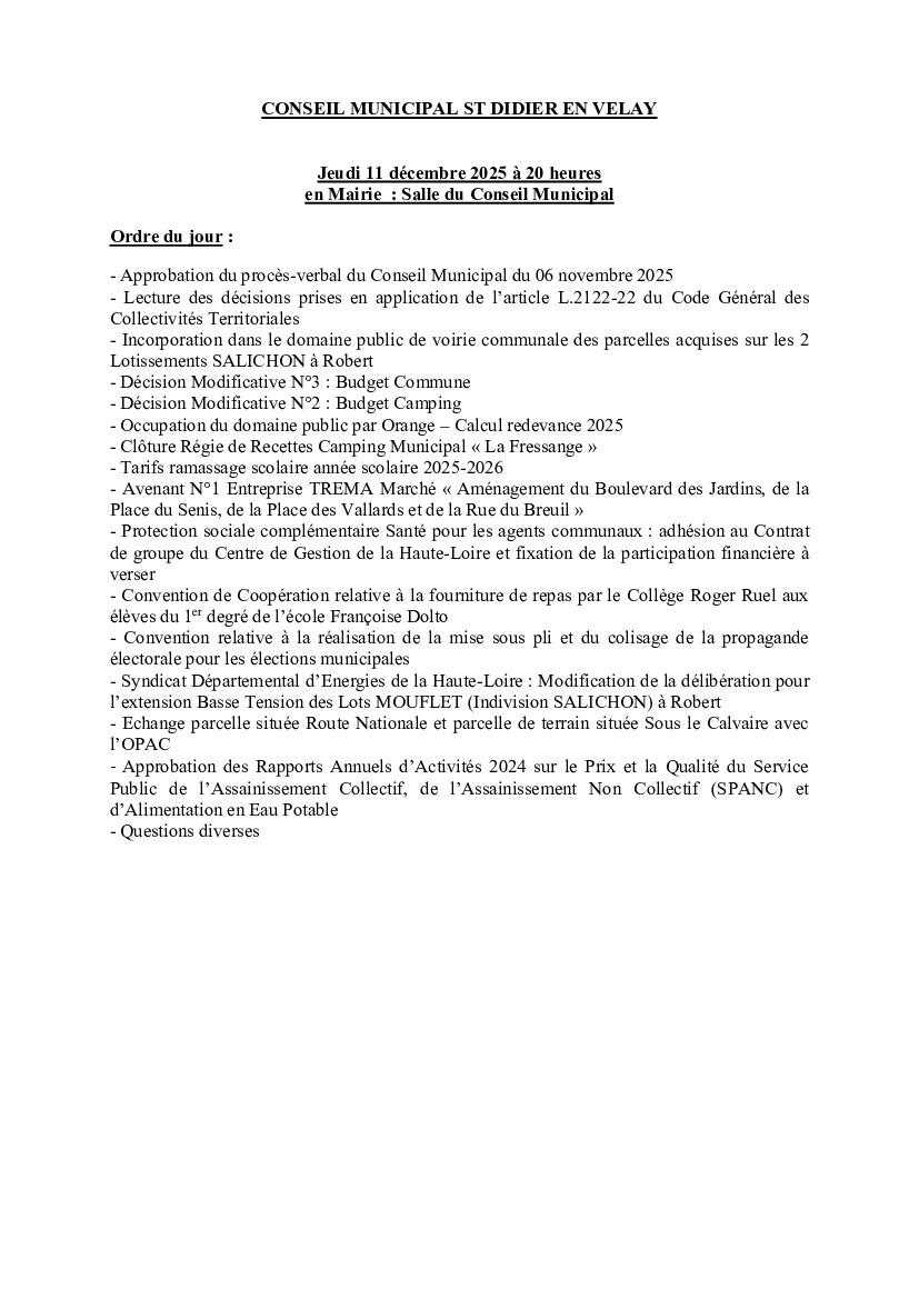 Ordre du jour du prochain conseil municipal, le 11 décembre