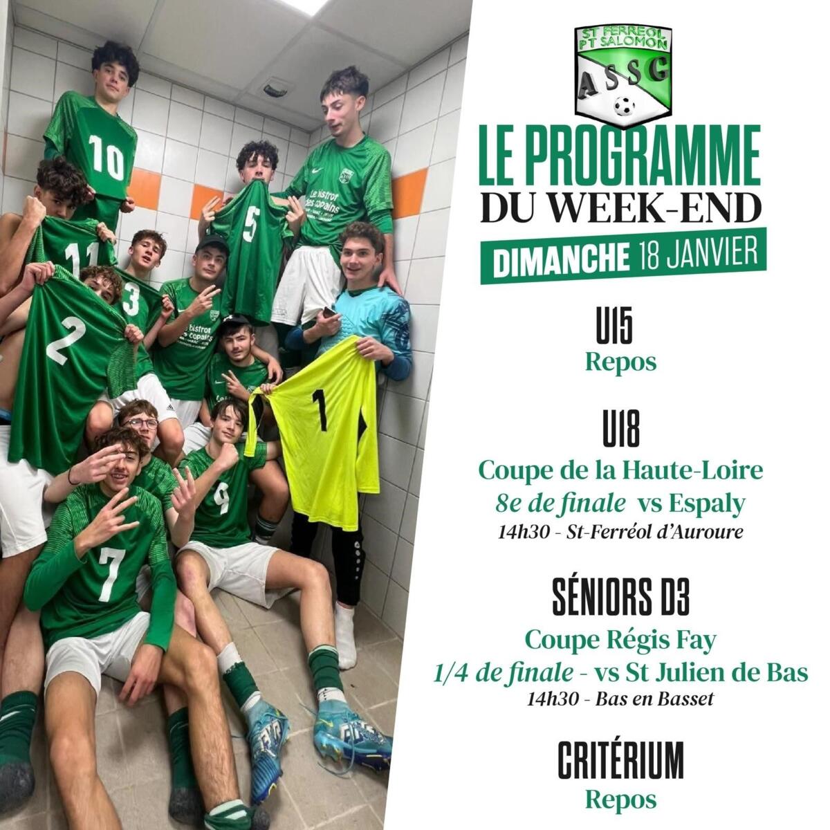 Programme des rencontres de l'ASSG FOOT 1/15/26 ⚽Veuillez trouver les programmes des rencontres de ce week-end.
