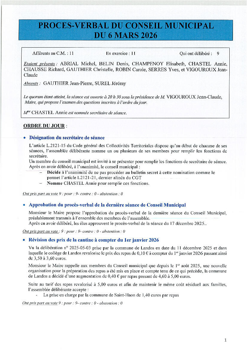 Your town hall / News / PROCÈS-VERBAL DU CONSEIL MUNICIPAL DU DU 6 MARS 2026