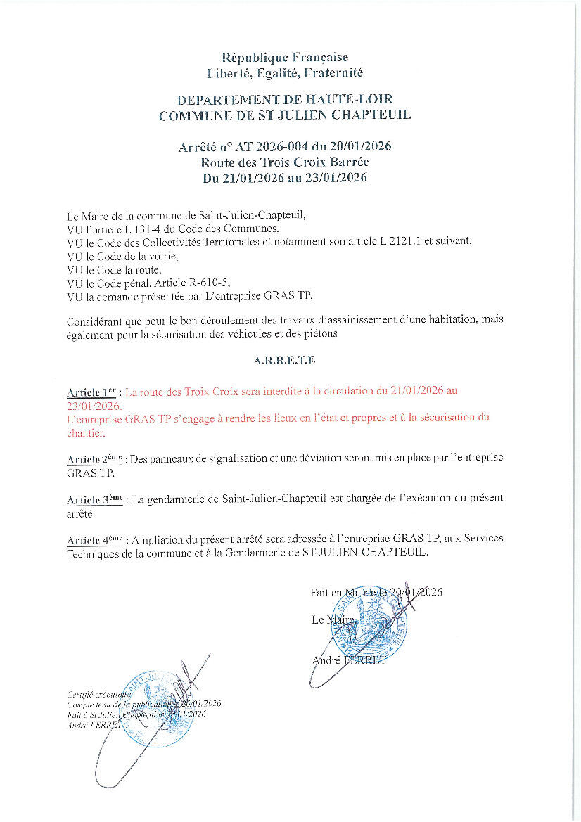 FERMETURE ROUTE DE TROIS CROIX DU 21 AU 23 JANVIER 2026