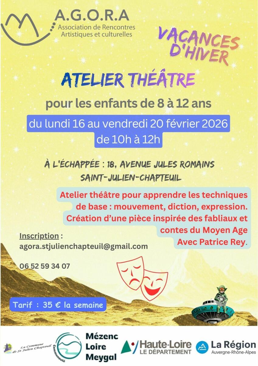 AGORA propose durant les vacances scolaires un atelier théâtre à L'Échappée du lundi 16 au vendredi 20 février.
