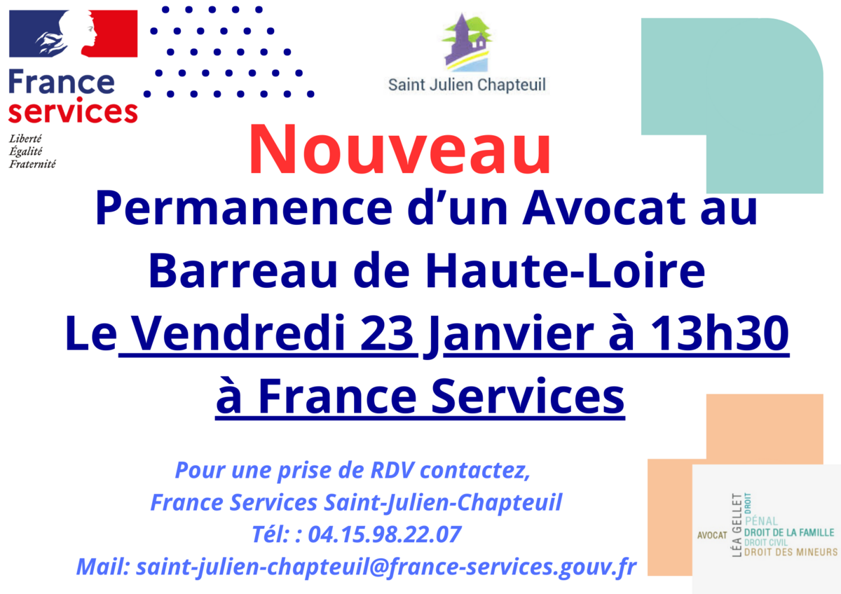 Permanence Avocat France services 23/01/2026 1/7/26 NOUVEAU : permanence d'un Avocat le vendredi 23 janvier 2026 à 13h30.
