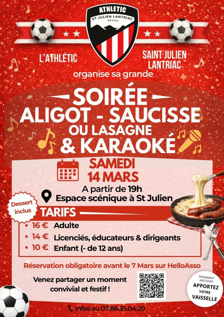 samedi 14 mars à 19 h Soirée organisée par l'athlétic foot St Julien Lantriac.