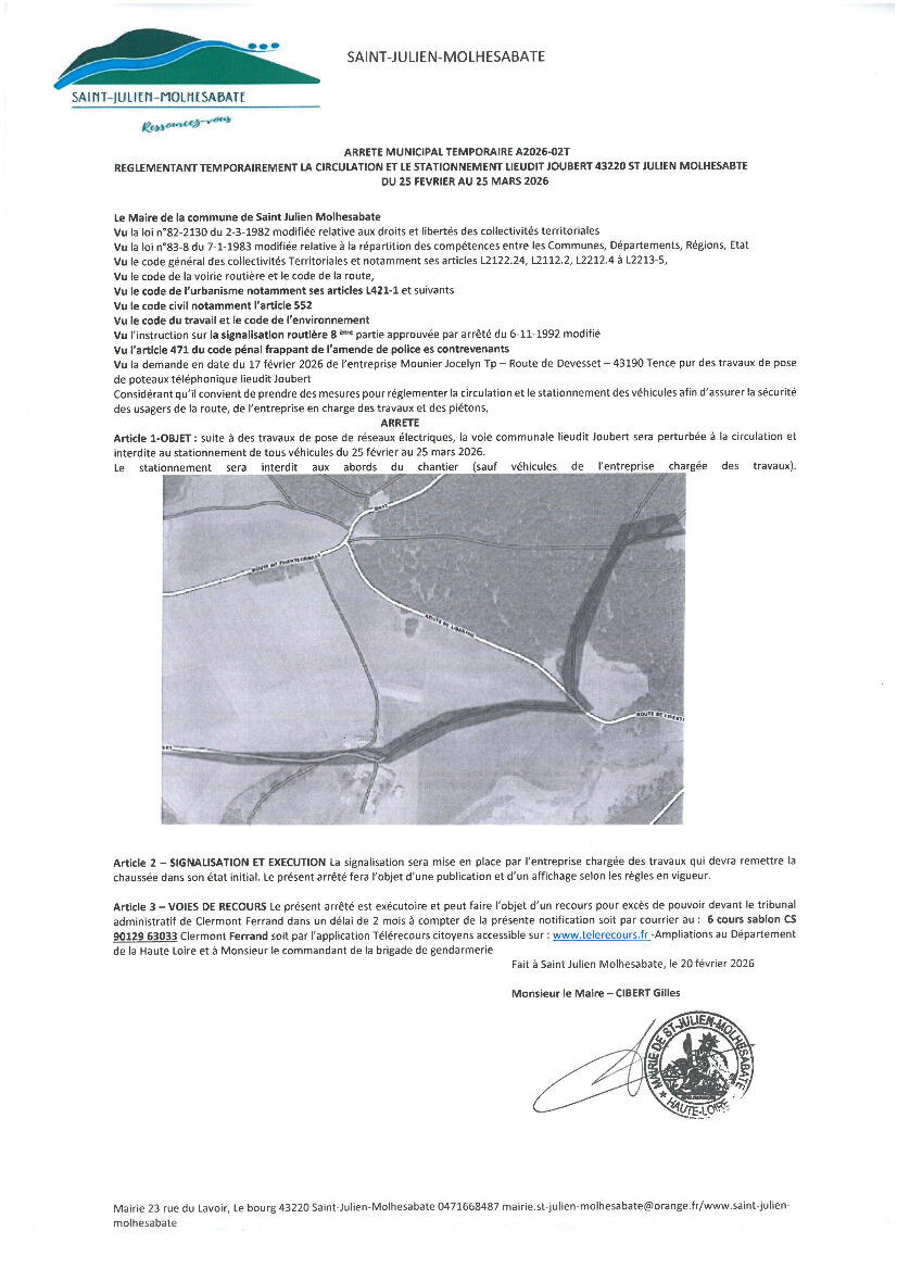 travaux Joubert 3/12/26 Circulation réglementée du 25/02/2026 au 25/03/2026 Source : Mairie de Saint-Julien-Molhesabate