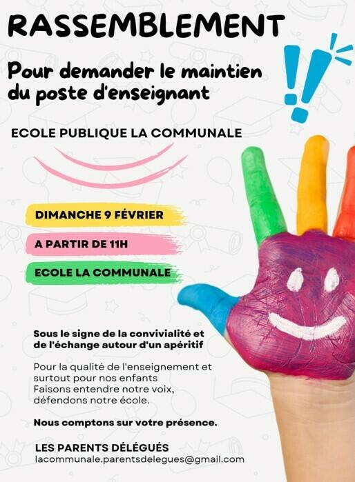 Notre école publique, "La Communale", est menacée par une fermeture de classe. Nous nous mobilisons, élus, parents et tous les membres de l'équipe d'école pour que la proposition de fermeture ne soit pas confirmée le 10 Février et ne soit pas officielle le 14 Février pour Septembre 2025.