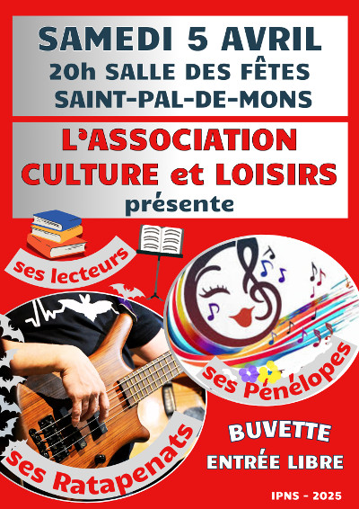 L’association Culture et Loisirs organise samedi 5 avril à partir de 20h, à la salle des fêtes, une soirée avec un récital des « Pénélopes », groupe vocal et un concert des « Ratapenats », groupe musiques et chansons.