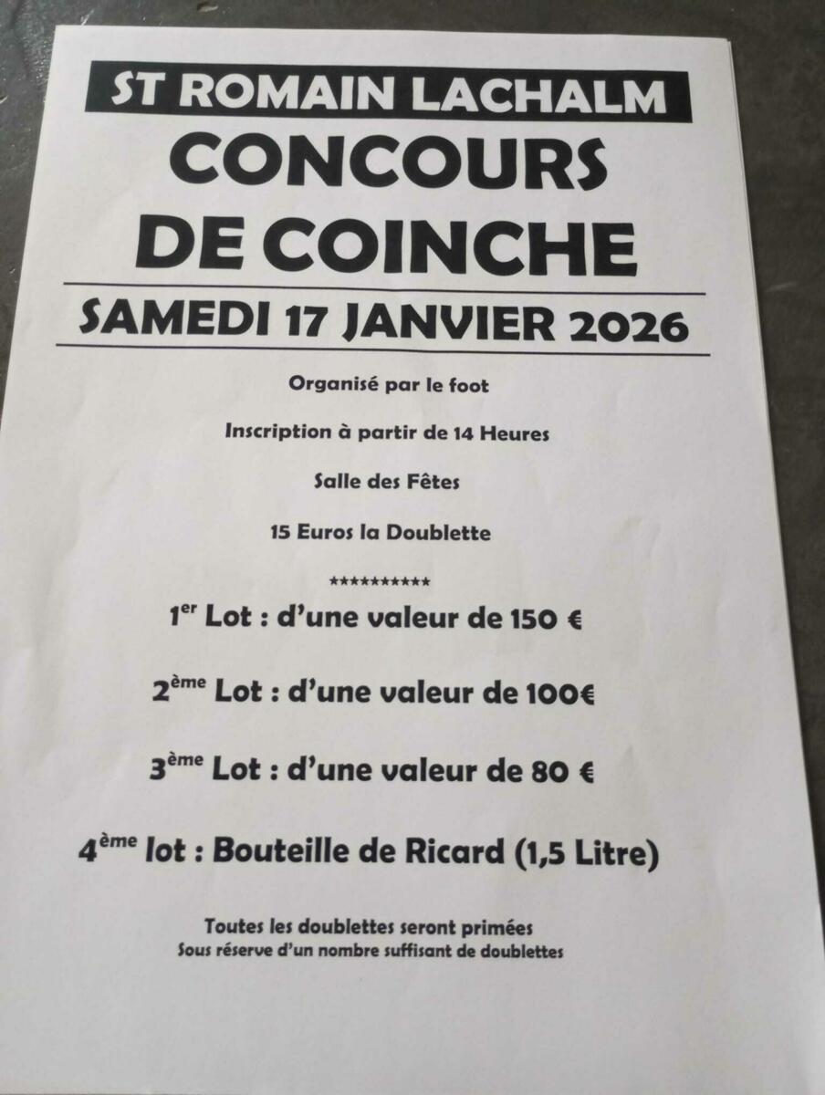 Concours de Coinche 1/6/26 Dimanche 17 janvier 14h00 salle des fêtes St Romain Lachalm Organisé par le foot.