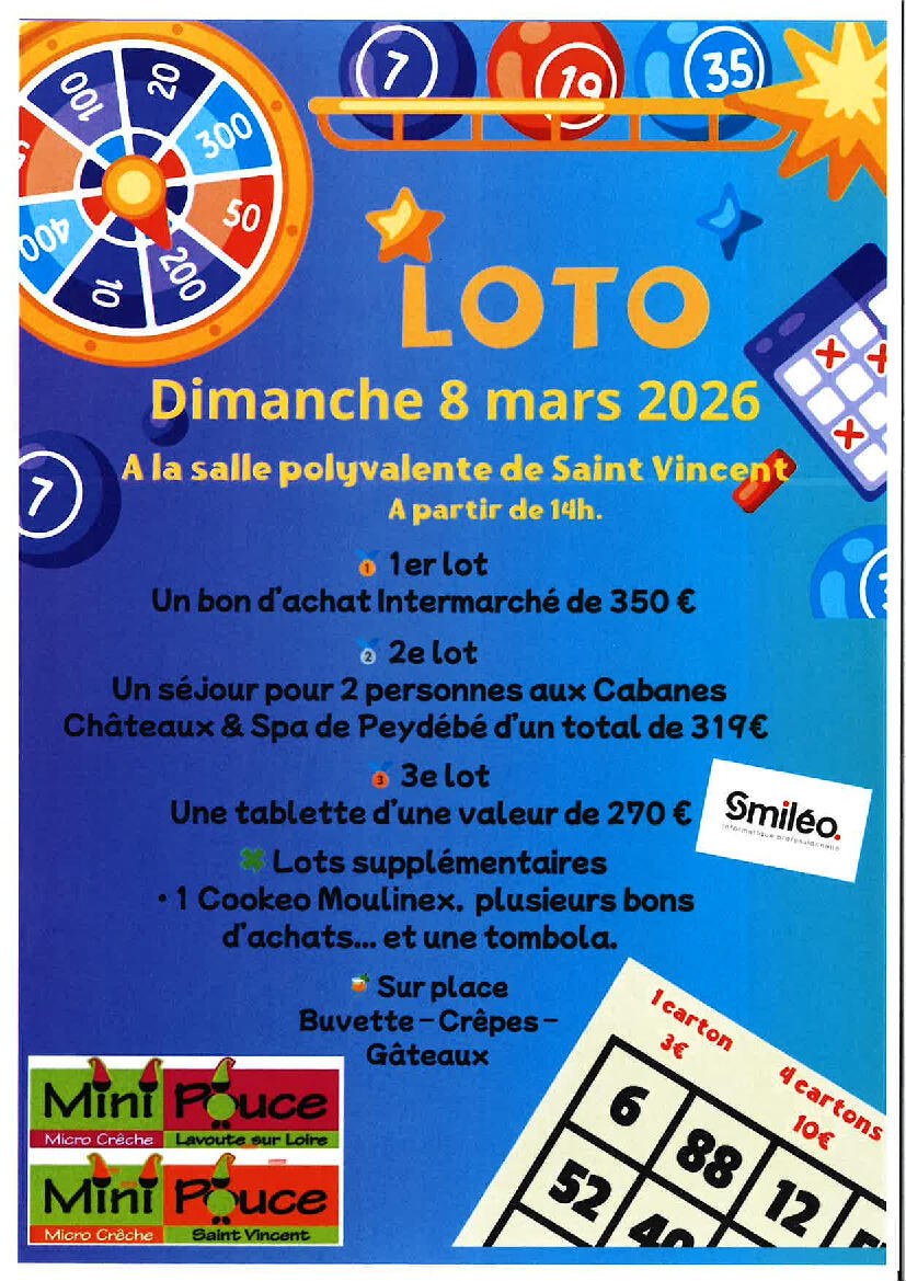 MINI POUCE organise un loto au profit des projets pour les enfants accueillis au sein des micro crèches. RDV le dimanche 8 mars 2026 à la salle polyvalente de ST VINCENT.