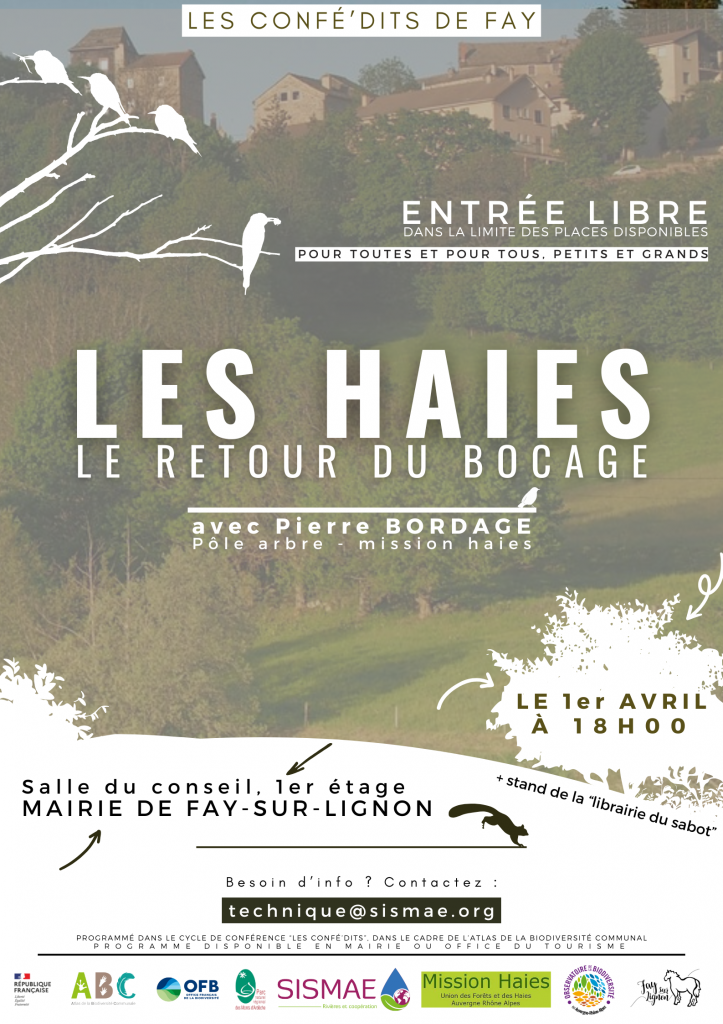 Le 1er avril aura lieu la conférence "Les haies : le retour du bocage", dans la salle du conseil à la mairie de Fay-sur-Lignon, à 18h.