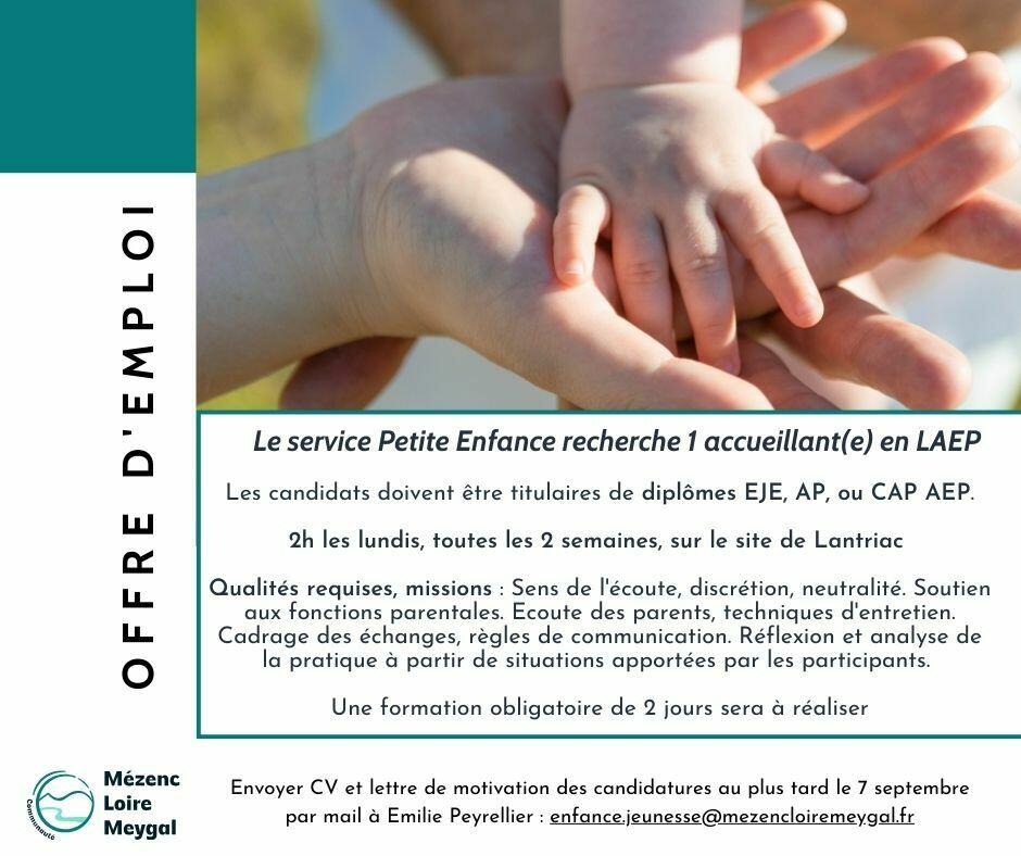 Offre d'emploi 8/27/25 La Communauté de Communes Mézenc Loire Meygal recherche un(e) accueillant(e) pour le LAEP de Lantriac.