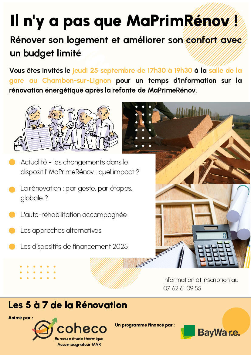 Le jeudi 25 septembre 2025, un événement gratuit et grand public se tiendra à La salle de la gare, au Chambon-sur-Lignon, de 17h30 à 19h30, pour apporter des réponses concrètes à toutes celles et ceux qui souhaitent améliorer le confort thermique de leur logement malgré les baisses d'aide MaPrimRenov'.
