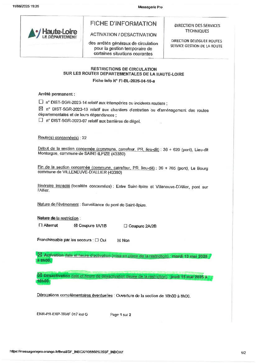 RESTRICTIONS DE CIRCULATION SUR LES RDS DE LA HAUTE-LOIRE 5/12/25 du mardi 13 mai 2025 au jeudi 15 mai 2025