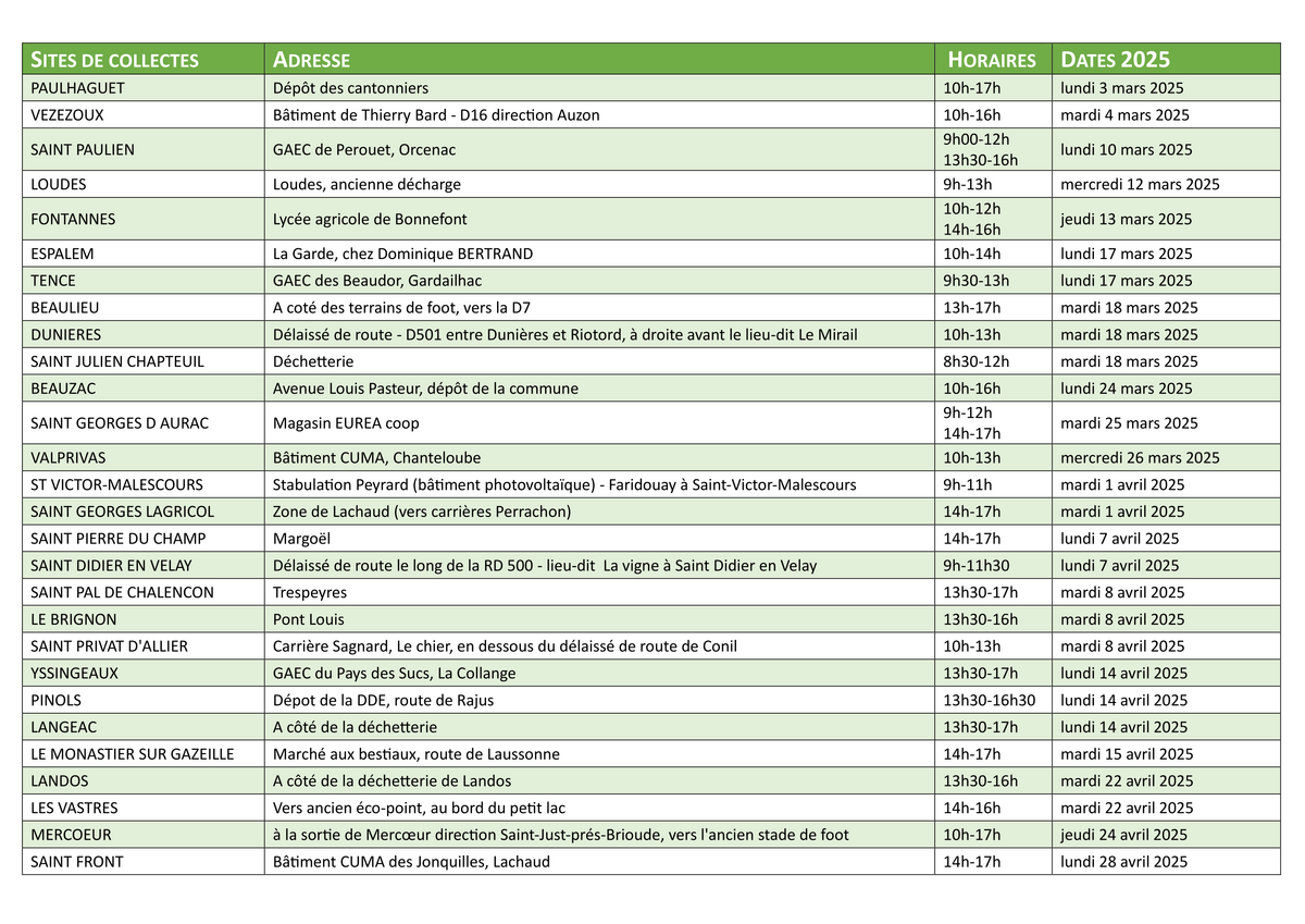 La Chambre d’Agriculture et la FDGEDA organisent l’opération campagne propre. Depuis plus de 15 ans cette opération permet aux éleveurs du secteur d’apporter les plastiques usagés (enrubannage, ensilage, ficelle et filet) sur une trentaine de sites sur l’ensemble du département de la Haute-Loire. Ces différents plastiques sont collectés et valorisés au sein d’une filière dédiée. En 2024, 794 tonnes de plastiques usagés agricoles ont été collectées sur le département de la Haute-Loire.