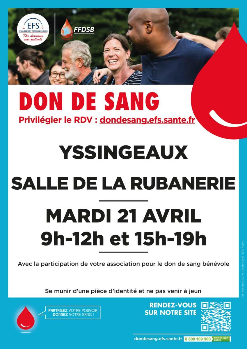 Collecte de sang 4/18/26 Collecte de sang le mardi 21 avril à la rubanerie Source : Associations d'Yssingeaux