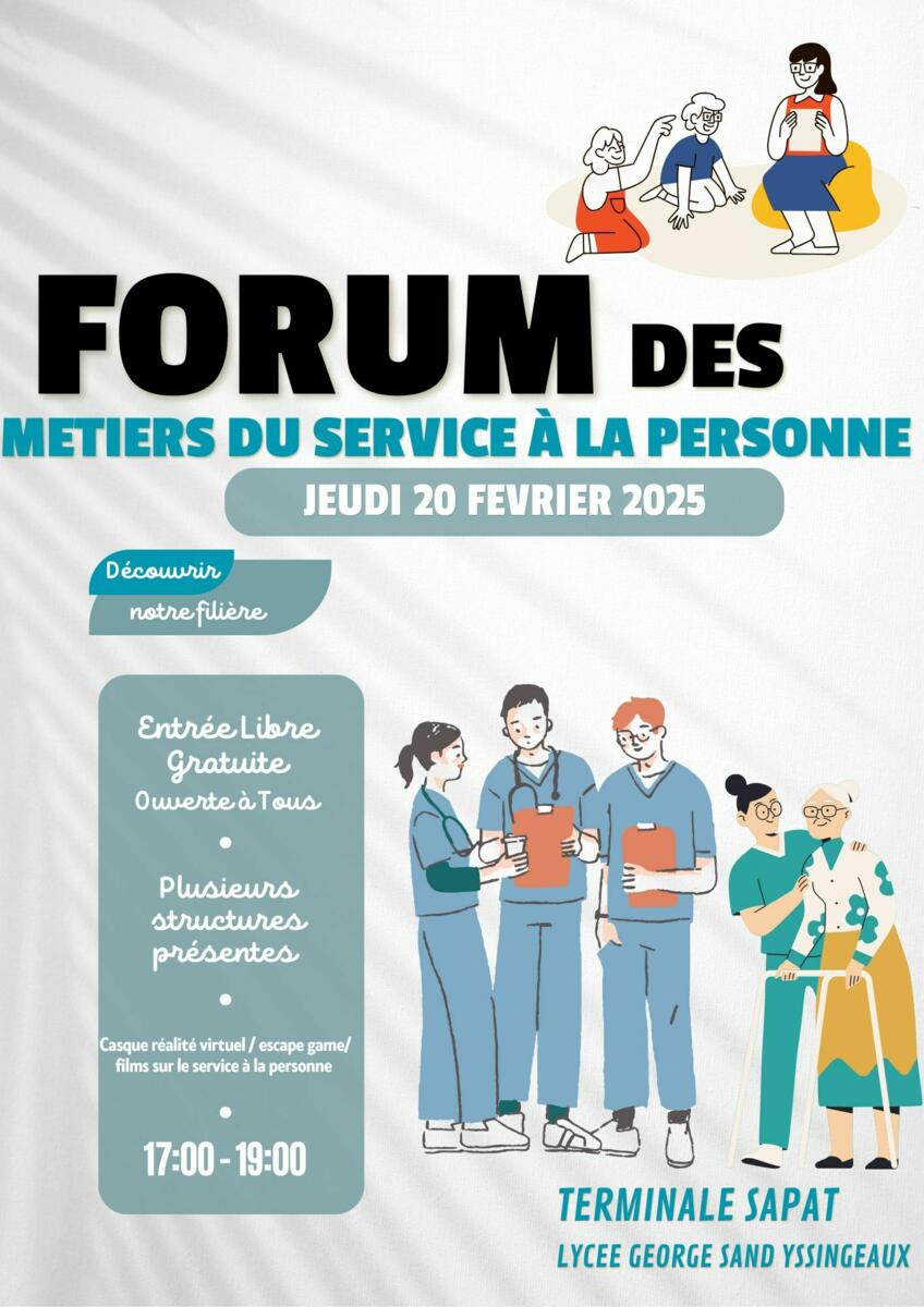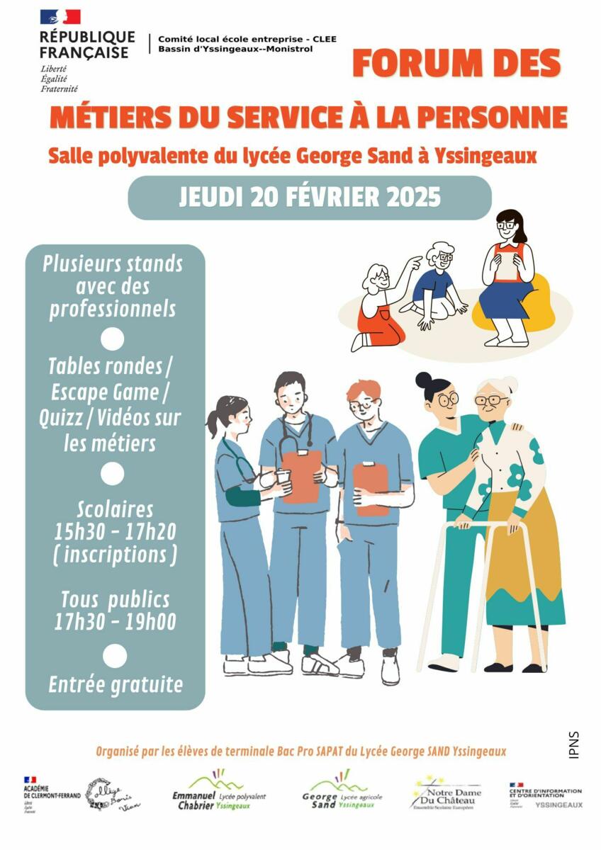 Jeudi 20 février aura lieu le forum des métiers du service à la personne, de 17 h 30 à 19 heures, en salle polyvalente du lycée George-Sand à Yssingeaux.