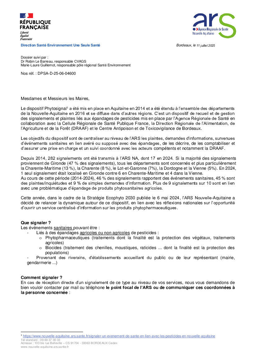 Aussi, nous vous remercions de bien vouloir relayer l’information sur le fonctionnement de Phytosignal auprès de vos administrés qui vous signaleraient une exposition aux pesticides.