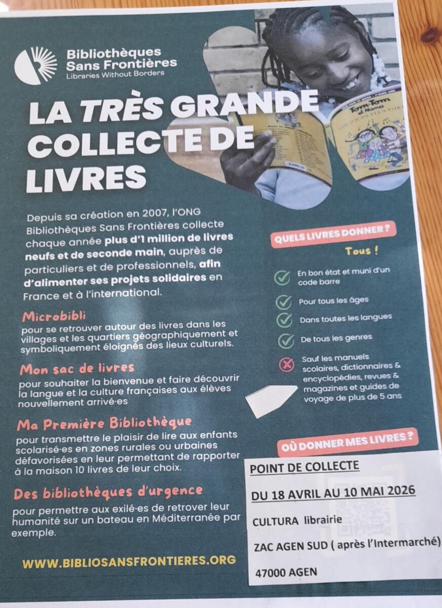 le point de collecte unique : La librairie CULTURA à la ZAC sud d'Agen (voir affiche jointe)