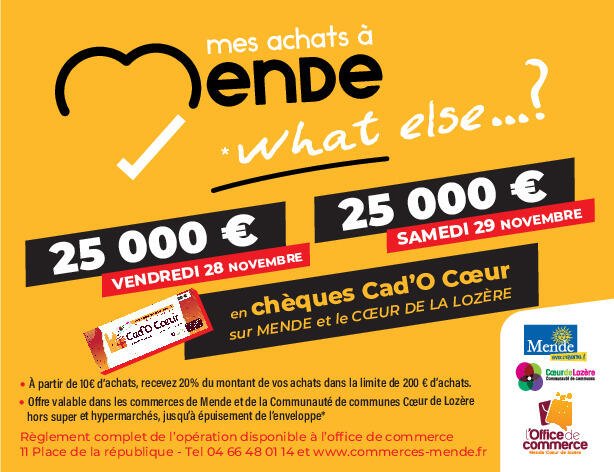 L’opération « Mes achats à Mende, What Else… ? » fait son grand retour cet automne pour vous permettre d’être remboursé à hauteur de 20 % sur le montant de vos achats sous forme de chèques Cad’O Cœur !