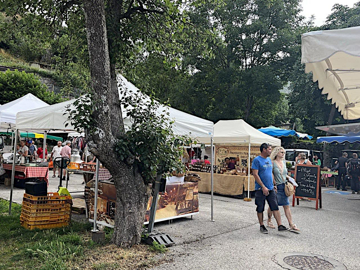Comme chaque été, le marché du mercredi matin se tient sur la place de l'église, au Pont-de-Montvert.