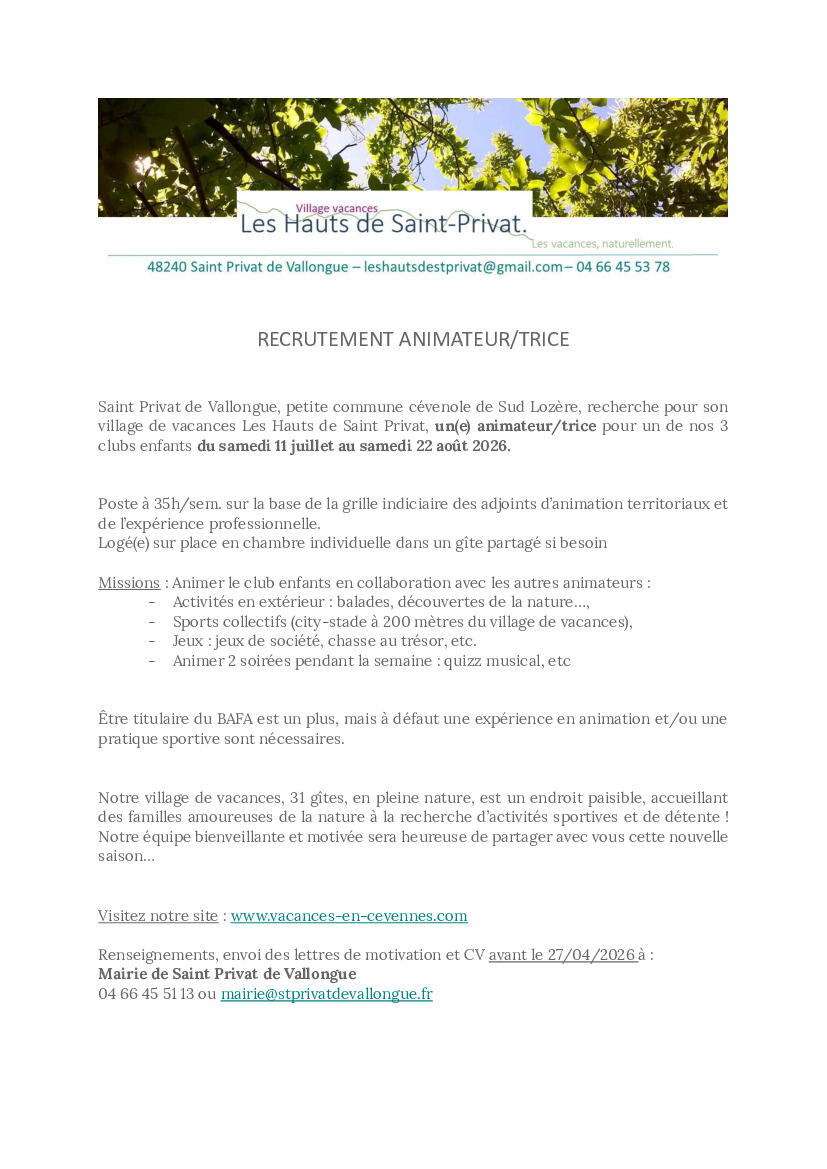 La commune de Saint Privat de Vallongue recherche pour son Village de Vacances