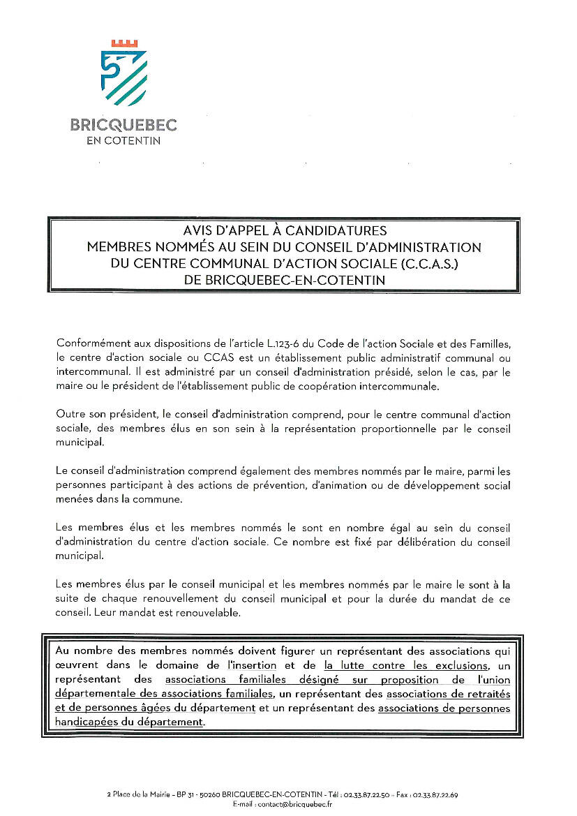Veuillez trouver en téléchargement l'avis d'appel à candidature des membres nommés au sein du conseil d'administration du centre communal d'action sociale (CCAS) de Bricquebec-en-Cotentin.