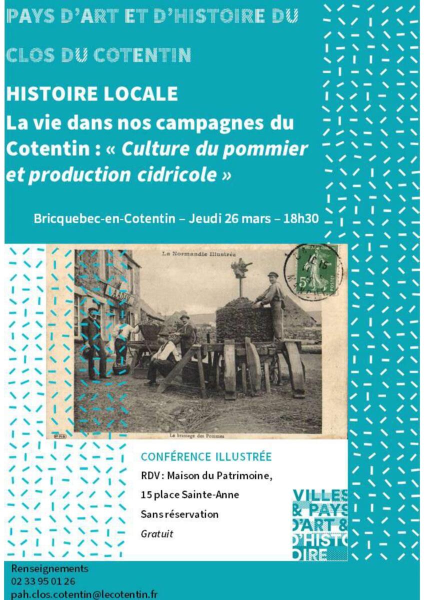 Dans le cadre des causeries consacrées à la vie et aux pratiques agricoles en Cotentin, proposées par le Pays d’art et d’histoire du Clos du Cotentin, sera présentée le jeudi 26 mars, une conférence intitulée « Culture du pommier et production cidricole »