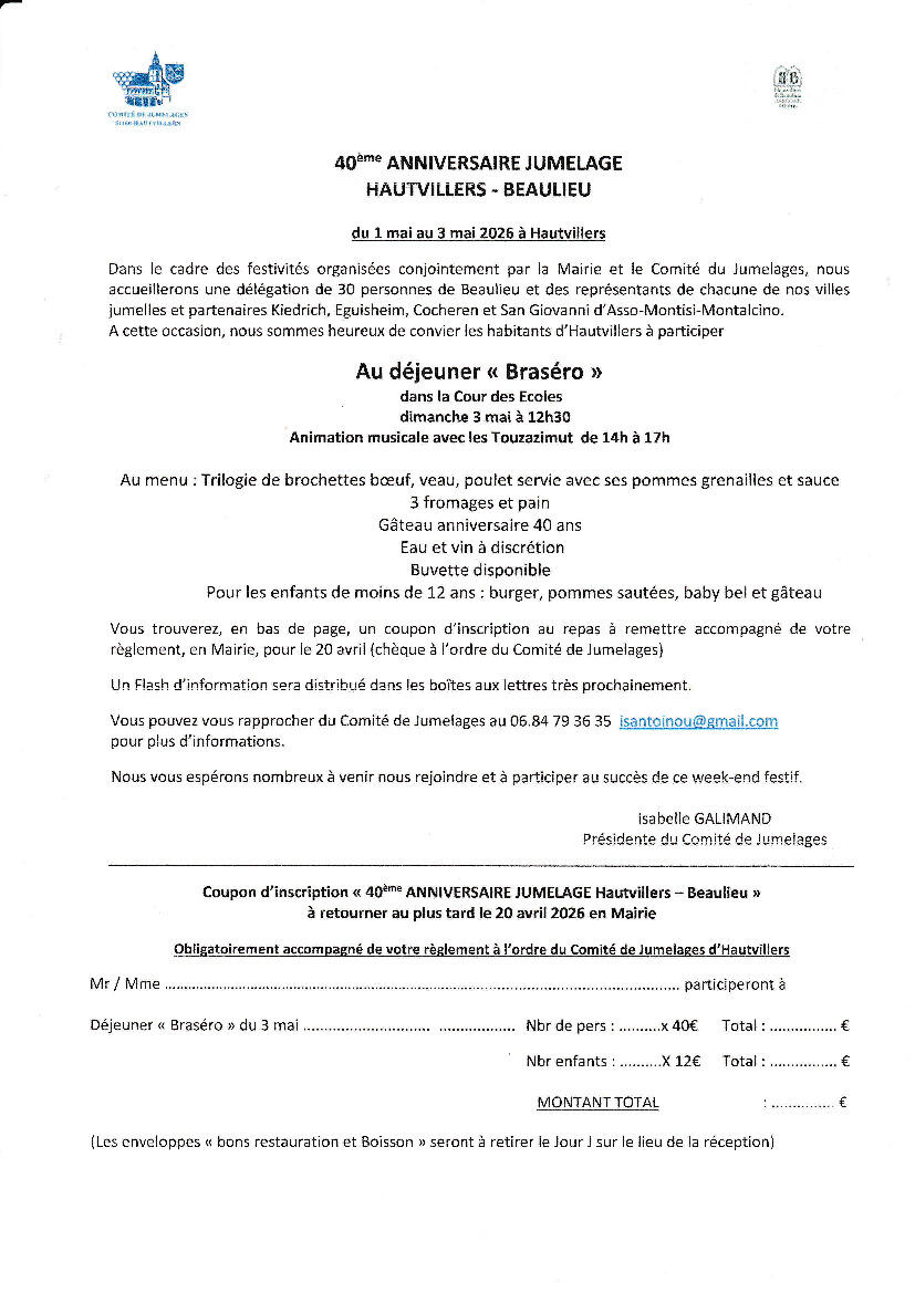 Invitation au déjeuner "Braséro" pour le 40eme anniversaire du jumelage HAUTVILLERS- BEAULIEU