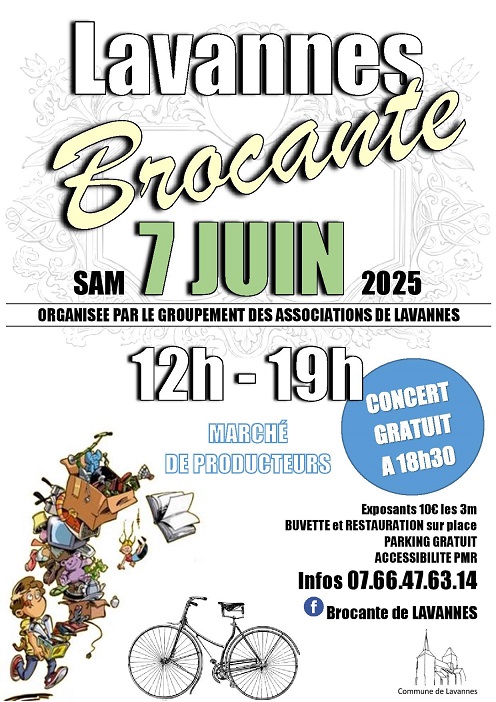 Le Groupement des Associations de Lavannes organise une brocante le samedi 7 juin 2025 de 12h à 19h, accompagnée d’un concert gratuit à 18h30.