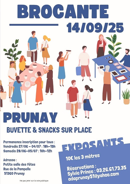 Rappel: BROCANTE à PRUNAY 9/7/25 L'ADAP organise la traditionnelle brocante le dimanche 14 septembre 2025. Source : Mairie de Prunay-en-Champagne