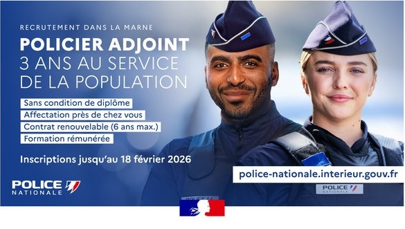 Jusqu’au 18 février 2026, la Police Nationale de la Marne recrute des policiers adjoints à Reims, Châlons-en-Champagne ou Épernay ! Les épreuves de sélection se dérouleront à Reims et les candidats reçus suivront une formation rémunérée de 18 semaines avant une affectation à Reims, Châlons-en-Champagne ou Épernay.