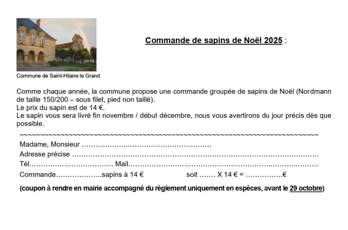 Commande de sapins 10/16/25 Ci-joint le coupon pour la commande groupée des sapins de Noël. À rendre en mairie avant le 29 octobre.