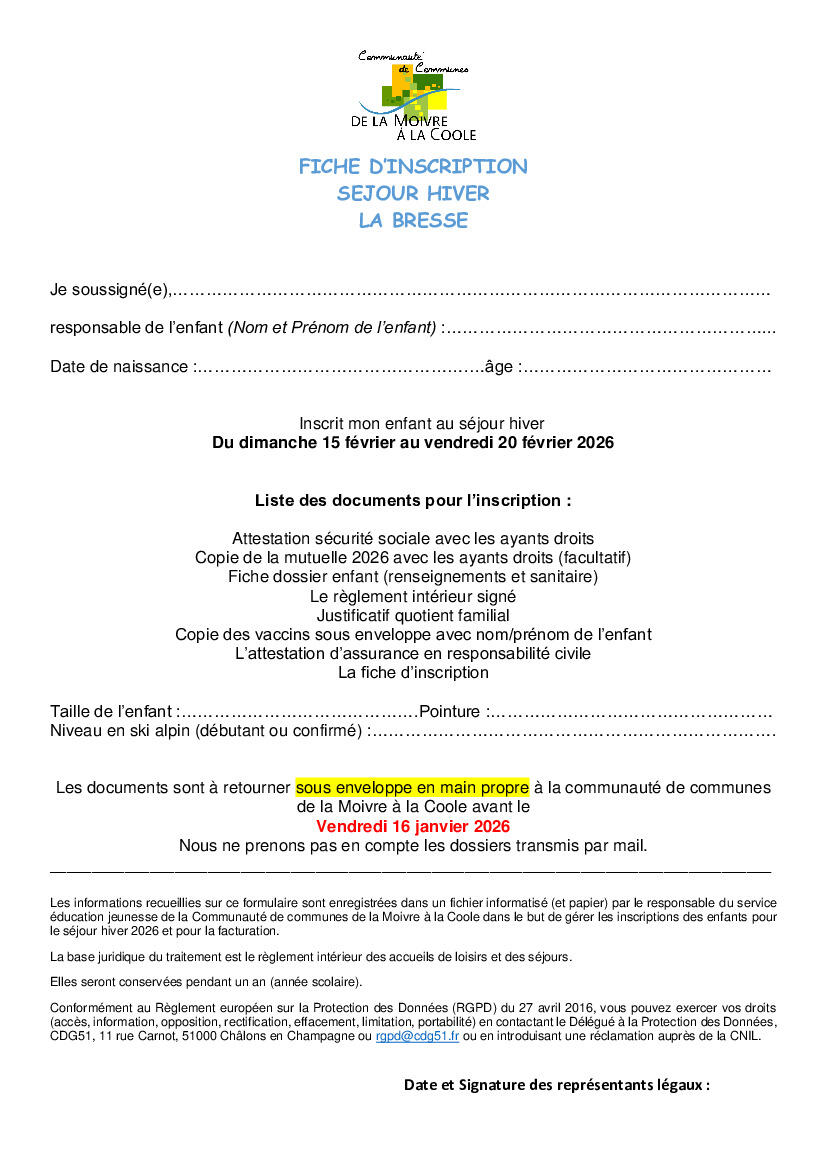 es inscriptions seront ouvertes du 5 au 16 janvier 2026 remise en main propre à la CCMC.