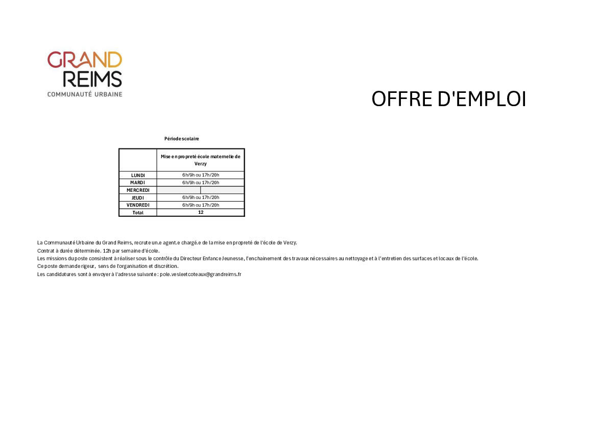 Offre d'emploi agent propreté - Ecole de Verzy