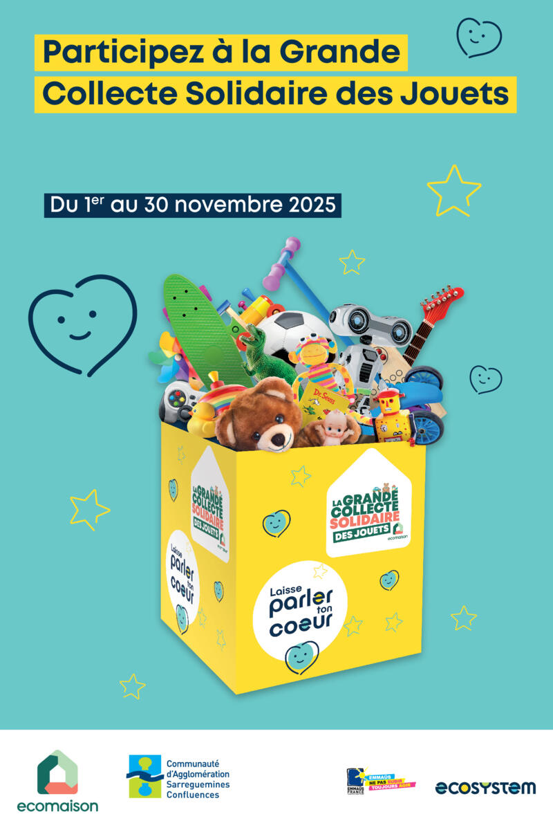 La Communauté d'Agglomération de Sarreguemines Confluences et le SYDEME, s'associent à Eco-Systèmes pour organiser une grande opération de collecte de jouets d'occasion intitulée "Laisse parler ton coeur" qui se tiendra sur le mois de novembre 2025 (du 1er au 30 novembre).