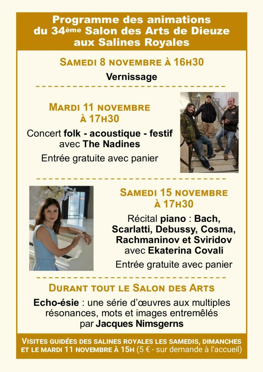 ℹ️ Animations musicales mardi 11 et samedi 15 novembre à 17h30, exposition Echo-ésie mots et images entremêlés, visites guidées des salines possibles les samedis, dimanches et le mardi 11 novembre à 15h