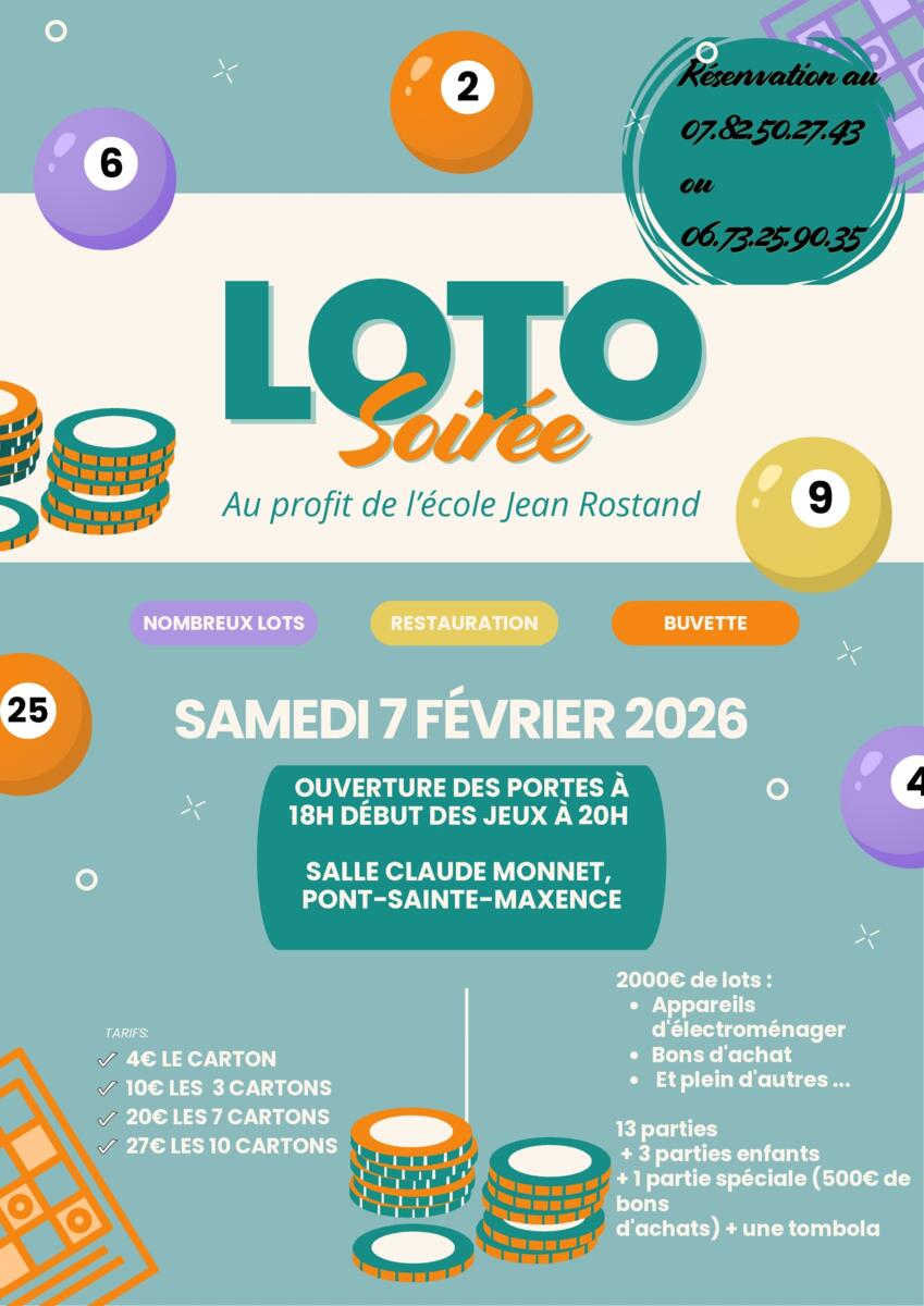 Une soirée loto est organisée le samedi 7 février à la salle Claude Monnet, au profit de l'école Jean Rostand. Ouverture des portes à 18h, début des jeux à 20h. Restauration sur place. Tarifs : 4€ le carton, 10€ les 3, 20€ les 7 et 27€ les 10. Réservation au 07 82 5027 43 ou au 06 73 25 90 35.