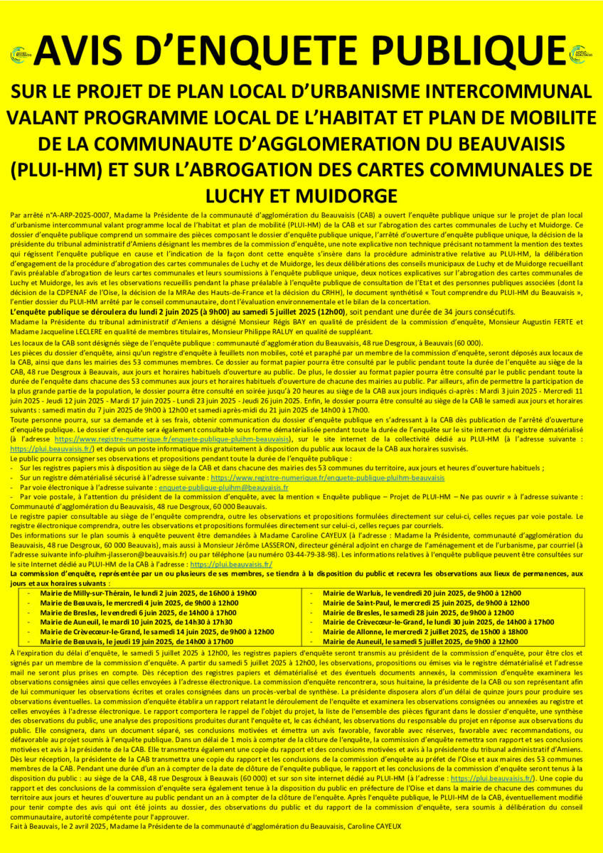 Enquête publique au Plan Local d'Urbanisme Intercommunal valant Habitat et Mobilités du lundi 2 juin (à 9h) au samedi 5 juillet 2025 (à 12h). Nous vous rappelons que les documents sont consultables aux heures d'ouverture de la mairie : de 9h à 12h les lundi, mardi, mercredi et vendredi