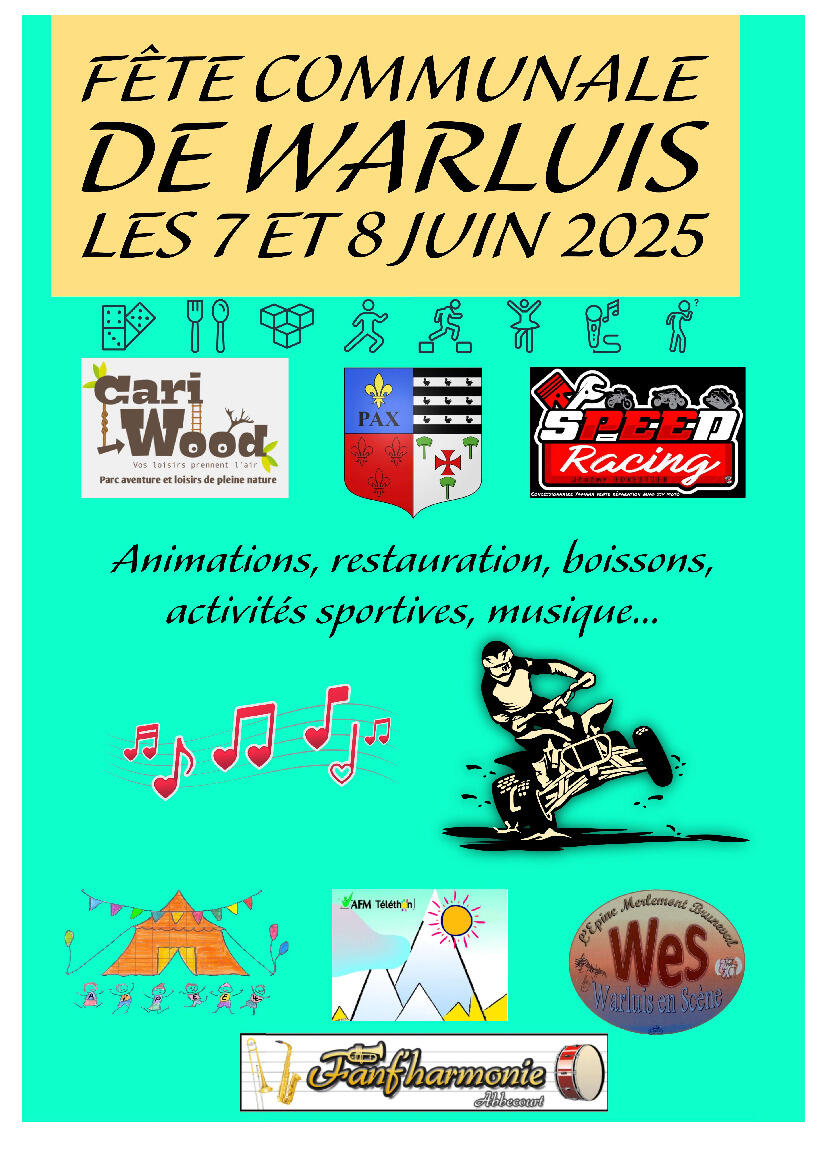 Réservez votre week-end de la Pencôte, une fête communale pas comme les autres avec les quads de Speed Racing, les jeux de Cariwood, une restauration assurée non-stop par les associations, le dimanche matin la fanfare d'Abbecourt...