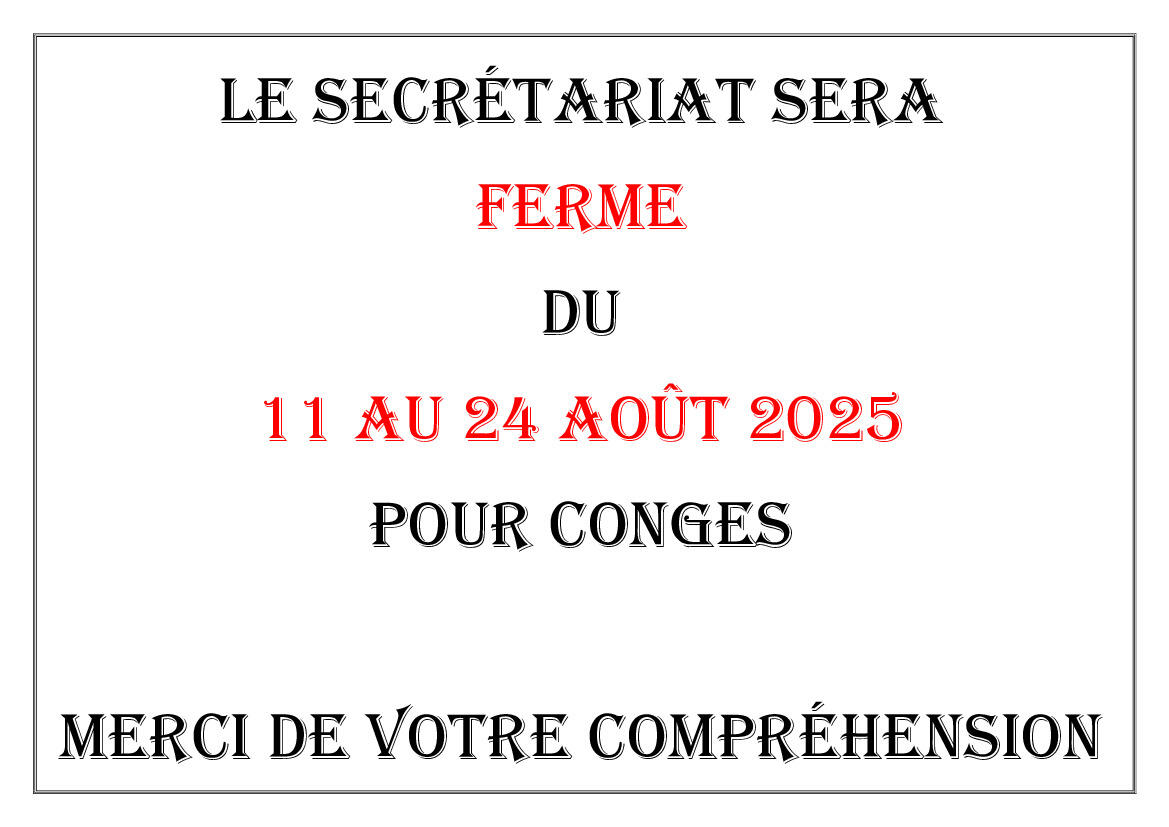 Le secrétariat sera fermé du 11 au 24 Août 2025 pour congés